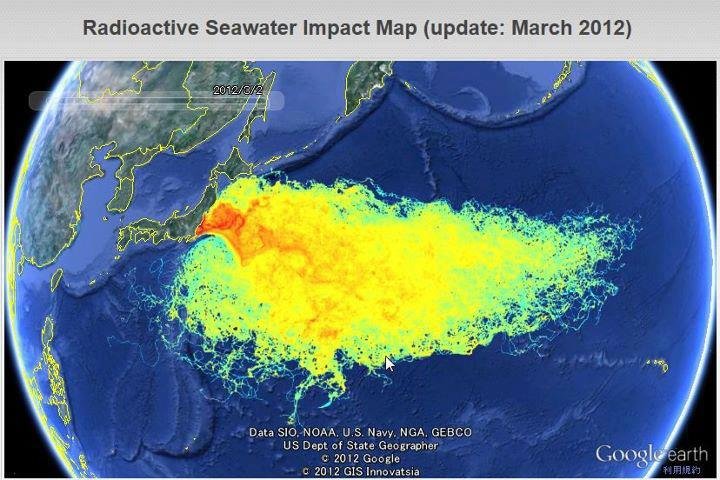 На снимката: Карта на радиоактивното замърсяване в Тихия океан - 1 година след аварията в АЕЦ Фукушима