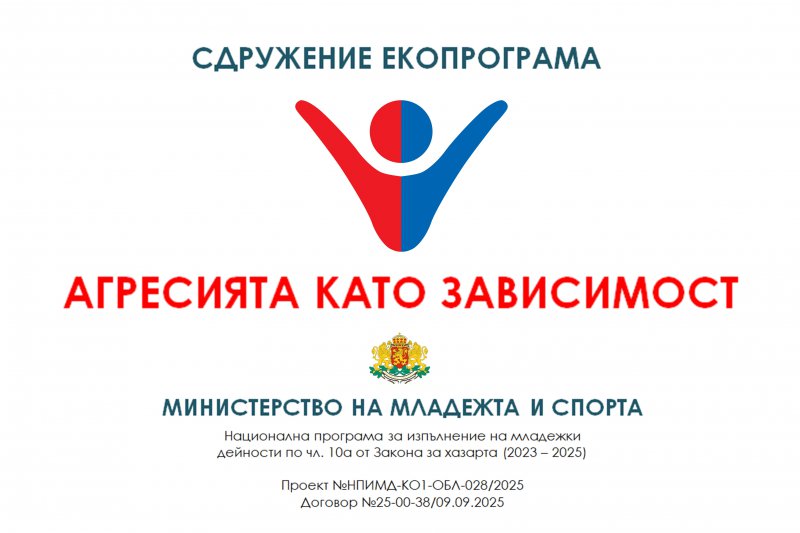 *Проектът „Агресията като зависимост” на Сдружение „Екопрограма” се осъществява с подкрепата на Министерството на младежта и спорта по Националната програма за изпълнение на младежки дейности по чл.10а от Закона за хазарта (2023-2025). (НПИМД-КО1-ОБЛ-028/2025, Договор №25-00-38/09.09.2025)